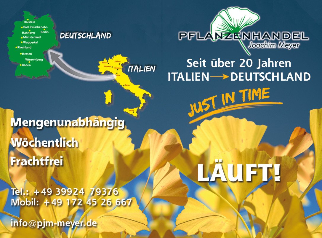Pflanzenhandel Joachim Meyer ist der Spezialist für die Lieferung hochwertiger Pflanzen direkt aus Italien! Über 30 feste Lieferanten gewähren eine kontinuierliche Verfügbarkeit der Sortimente über die ganze Saison. Vom Bonsai über den Solitärbaum und Strauch bis zum Citrus ist das gesamte Sortiment verfügbar!